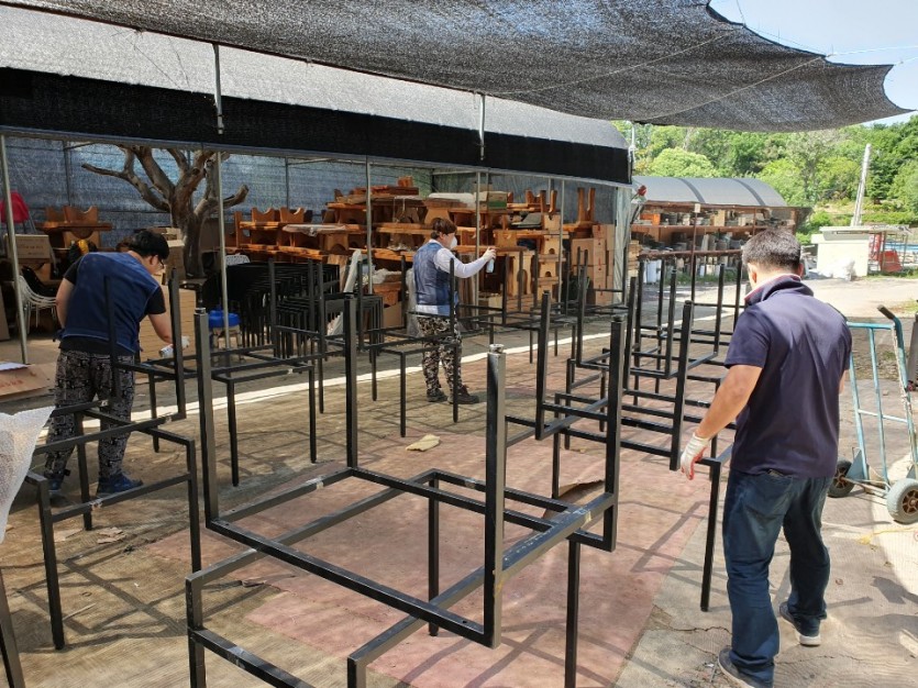 중고 사각 다리를 글라인더 질을 하여 보수하고 락카칠로 마무리 작업 중입니다
