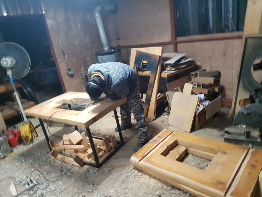 업종을 바꾸게 되어 통나무 테이블에 타공을 하는 작업 중입니다