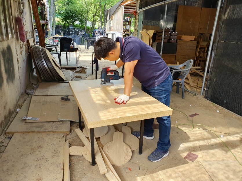 중고 테이블에 1구 렌지 타공을 작업 중입니다